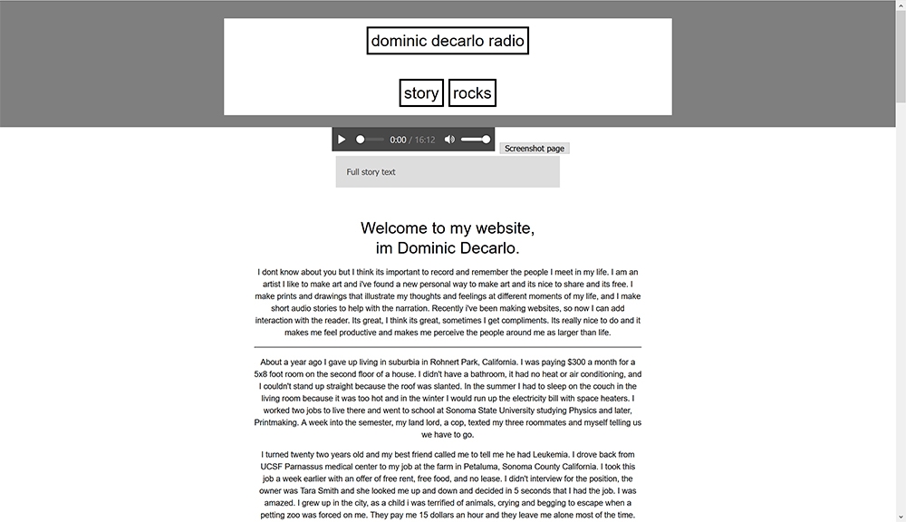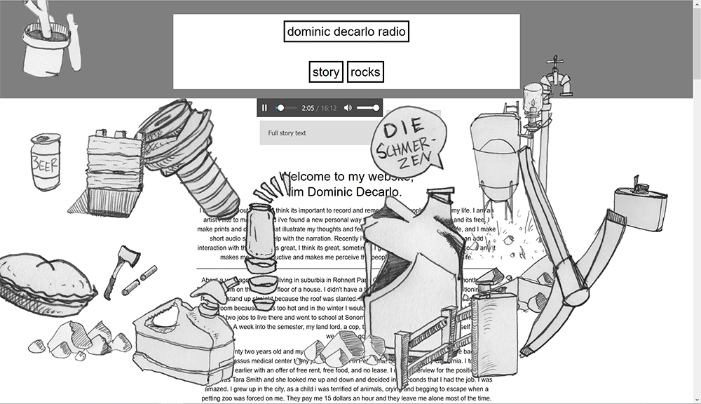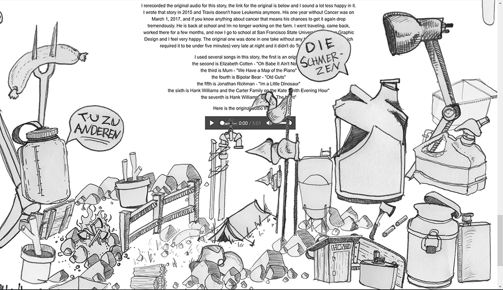 I wrote and recorded a radio story called Tractor in homage to Scott Carrier and other This American Life contributors. Accompanying the story is an interactive webpage and transcript of the story which the user can interact with while listening.