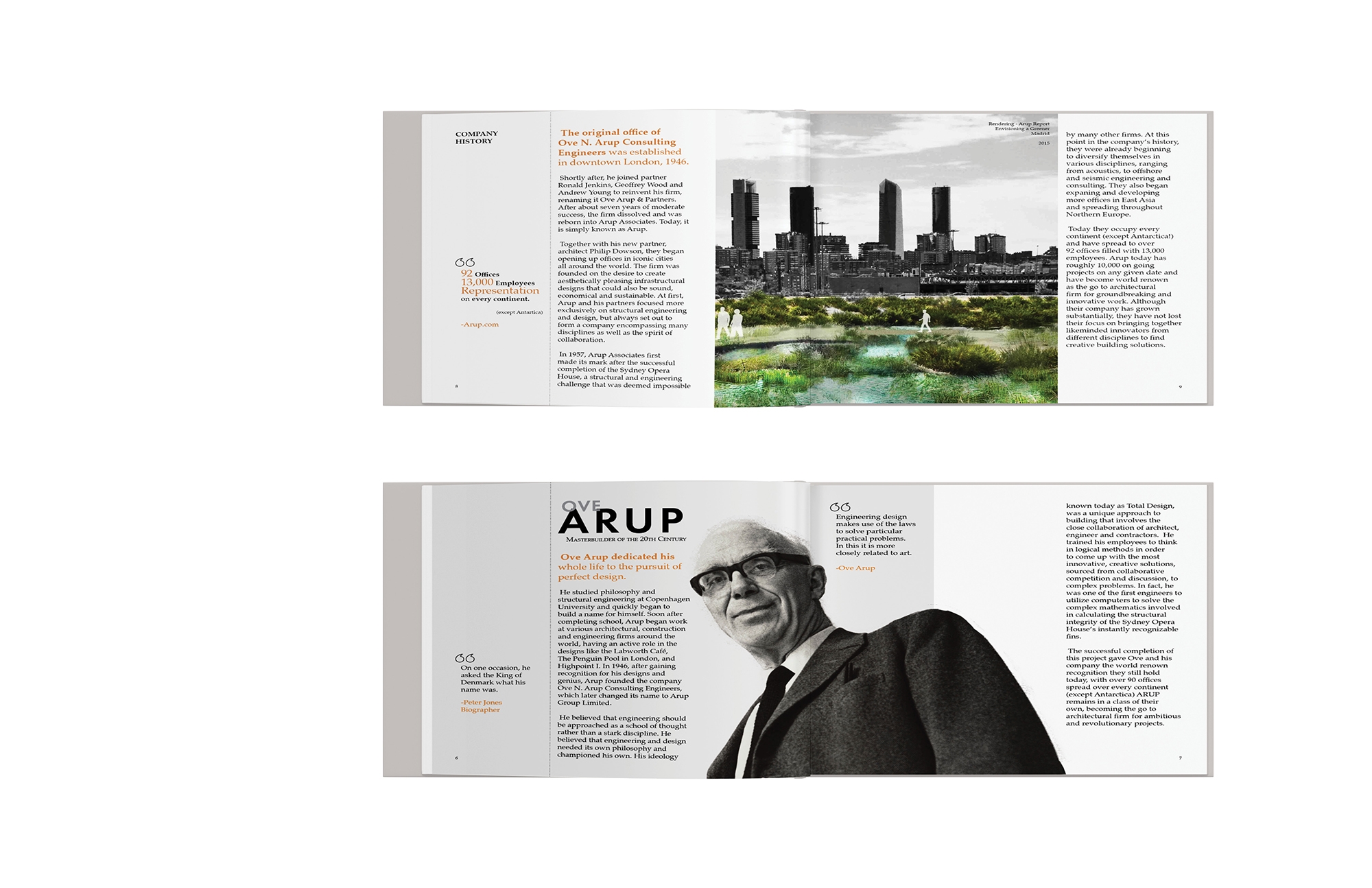 Assigned a project to do in depth research on a local architecture firm, I chose to research and develop ideas on ARUP and the concept of “Total Design”. Provided with my presentation on the creator, Ove Arup, and the business operations of today’s ARUP, this booklet was modeled to be an internal quarterly review booklet, describing the operations and innovations that ARUP had completed in 2016.