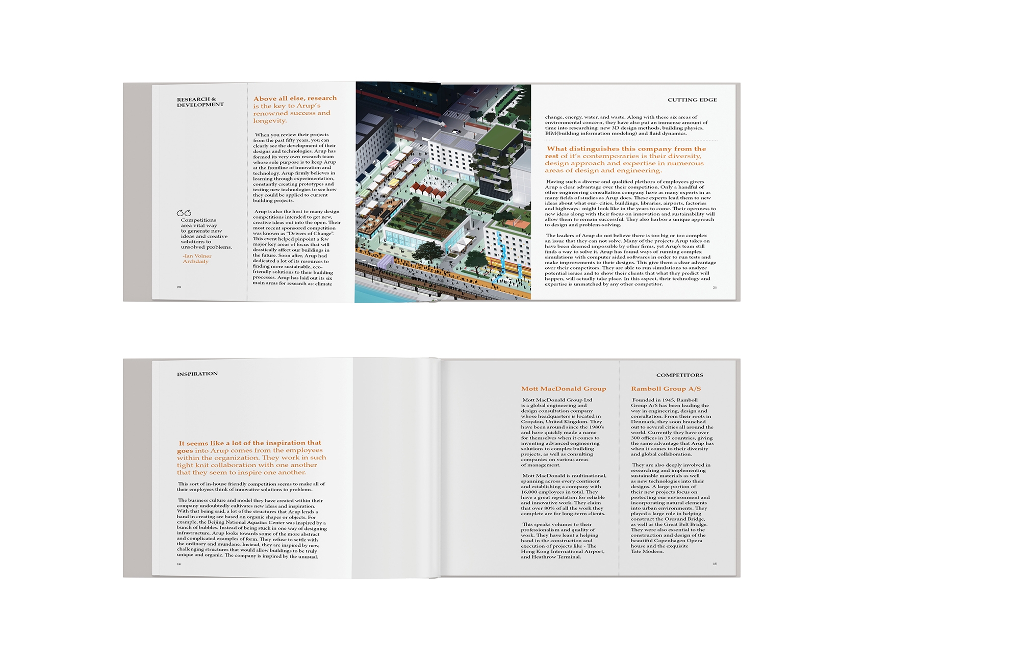 I designed this informational booklet with James Watts to accompany a presentation and speech about the architecture firm ARUP. I wanted it to look like an internal brief or financial review and treated the audience as employees of ARUP.