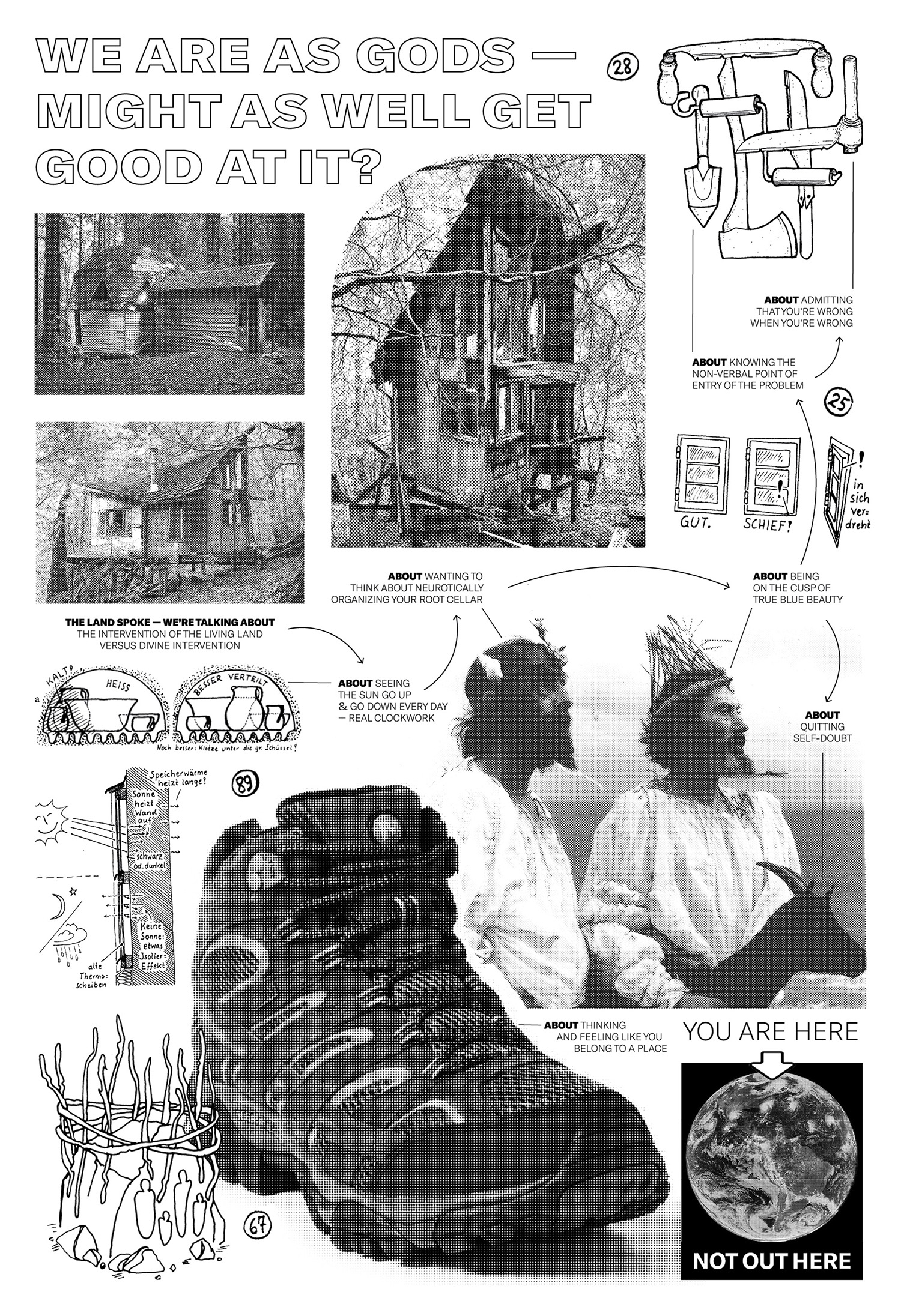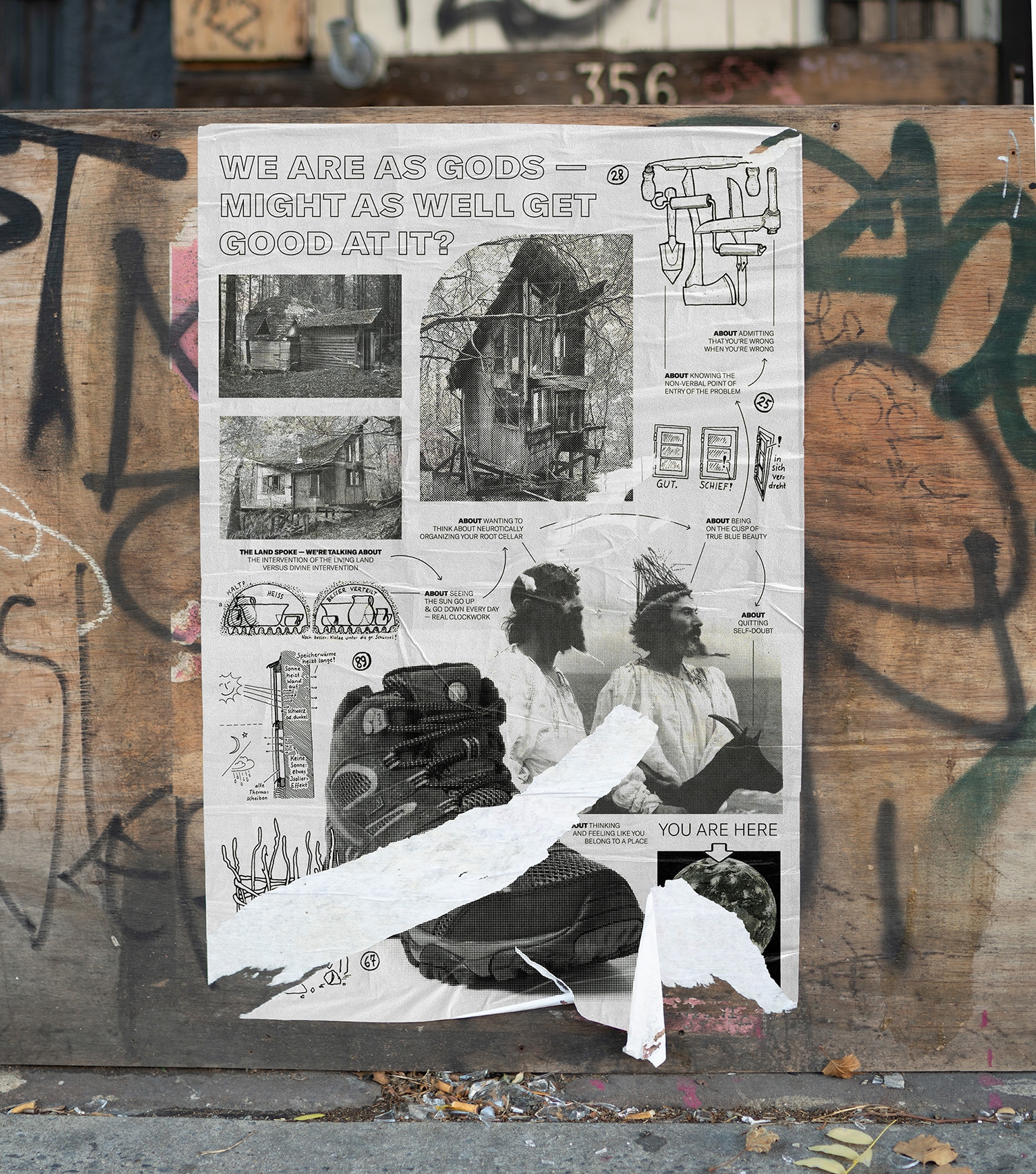 The design is about the earth and our role as caretakers, with the quote on top "WE ARE AS GODS MIGHT AS WELL GET USED TO IT!" taken from Stewart Brand and his Whole Earth Catalog.